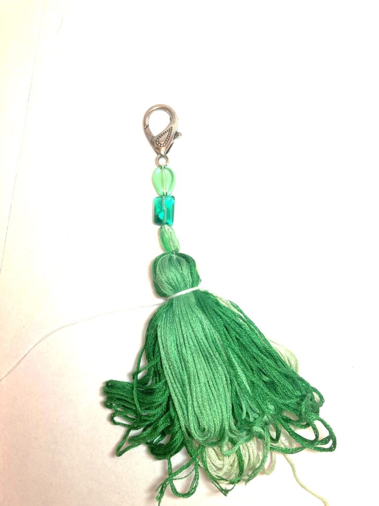 Trim your tassel by snipping through the embroidery thread ends (see below photo).